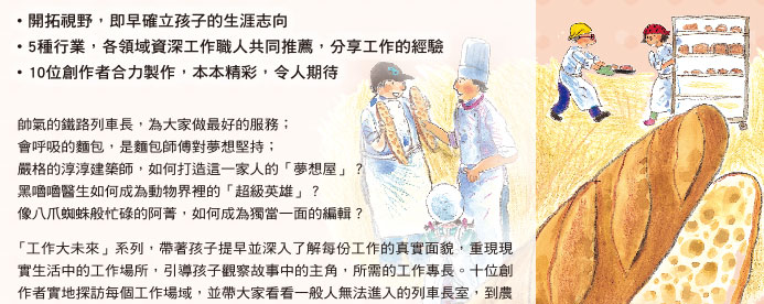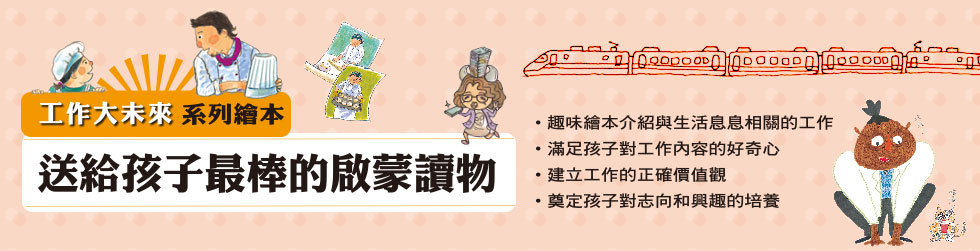 <%@ Page Language="VB" %> <%@ Register TagPrefix="uc" TagName ="TopLogo" Src ="~/ucTopLogo2.ascx" %> <%@ Register TagPrefix="uc" TagName ="TopMenu" Src ="~/ucTopMenu.ascx" %> <%@ Register TagPrefix="uc" TagName ="FooterContent" Src ="~/ucFooterContent.ascx" %> <%@ Register TagPrefix="uc" TagName ="ImageCode" Src ="~/ucImageCode.ascx" %> 工作大未來系列繪本(我要當編輯+獸醫黑嚕嚕的醫院+造夢築屋的建築師+鐵路列車長的一天+會呼吸的麵包與麵包師傅)