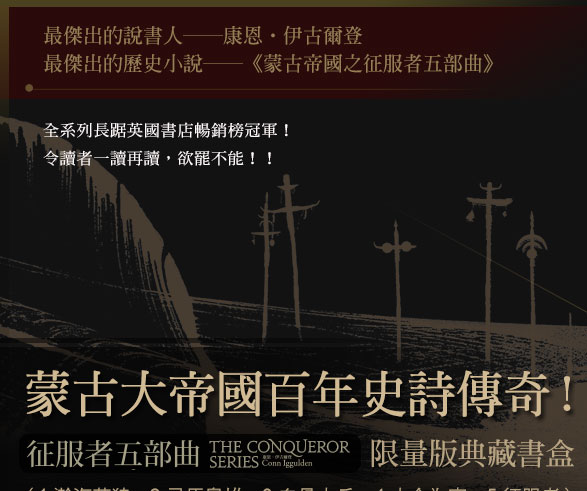「對,因為你還太年輕。」速不臺聳聳肩說。拔都聽見老人自顧嘆了口氣。「這座溪谷裏很可能有人的骨骸,屬於曾經覺得自己很重要的男男女女。我們想過他們嗎?我們和他們有同樣的恐懼和夢想嗎?當然沒有。他們對活人一點也不重要,我們甚至不知道他們的名字。我以前總覺得希望後人記得我,千年後有人傳頌我的名字,但即使那樣,我也不會在乎了,那時我已經化為塵土和鬼魂。甚至或許只有塵土,但我還希望我的精神長存。等你老一點,你就會明白唯一重要、真正最重要的是勇氣和品德。少了勇氣和品德,你不會死得更快,但你會連我們靴子上的塵土都不值。你還是會化作塵土,但你會浪費人生在世的短暫時間。沒錯,你父親失敗了,但他很英勇,他不希望辜負他的人民。他沒浪費生命。人生如此,夫復何求。」說話似乎耗去老人的力氣。他清清嗓子,朝地上一啐。「人生在世沒幾年。我死後,或是你死後,這些山巒還會在這裏。」