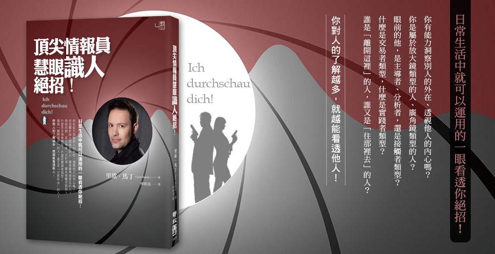 你將在本書中和我一起執行一項任務,任務的流程就像我的另一本書Ich krieg dich! 。如果你沒讀過那本書,別慌!進度還是可以趕得上,因為那並非執行此次任務的必要前提。我很確定,我們會組成一個強勁的團隊,激發與訓練你身上的情報員潛力。我會為你解密,露幾手識人術的基本絕招,讓你抓住穿透人性、洞悉人心的原則,從此你看待周遭人物與環境的眼光將截然不同,而且你本身的舉動乃至他人的行為也將由此幡然一新。情報員所到之處一定會發生改變,只是程度有別。我在本書中常使用德文陽性的文法用字,請把這當作是一種舉例。我當然知道許多女性情報員也非常出色…… 女性讀者亦然!