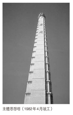 更重要的是,配合金日成生日完工的凱旋門及主體思想塔。凱旋門的揭幕式於四月十四日舉行,地點在金日成於一九四五年十月十四日發表演說的運動場附近。形狀是以巴黎的凱旋門為模型,但高度及門面寬度都比巴黎的凱旋門大,堪稱世界最大的凱旋門。主體思想塔則在四月十五日舉行揭幕式。主體思想塔建在大同江邊,隔著金日成廣場,幾乎在人民大學習堂的正對面。高一百七十公尺,用白色大理石建造。這個塔是以美國的華盛頓紀念塔為模型建造,但高度更高,北韓自稱為世界最大的塔。形狀是將塔往上層層堆疊的方式,前面與後面各有十八段,左右兩面則各別有十七段,共有七十段,代表金日成的年齡。塔的表面還貼有白色花崗岩石板,總共有二萬五千五百片,代表七十年的日數。建造這種具有象徵性的建築物,並非朝鮮的傳統,而是金正日個人的獨創。