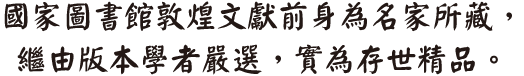 國家圖書館職司國家文獻典藏,自1933年籌備伊始,即以集藏中文古籍善本為重要使命。本館草創時期即遇戰火,銜命西遷之際,亦克服萬難,於1940-1941年間籌組「文獻保存同志會」(以下簡稱同志會)搶購古籍。繼於復員時期及遷台後,持續多方徵集,迄今以精緻豐美之12,922部(135,478冊)善本典藏稱譽於世。其中典藏之百餘卷敦煌卷子,多為戰時及復員期間所購得,是臺灣收藏敦煌文獻最為豐富之公家機關典藏單位。